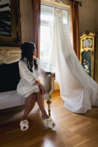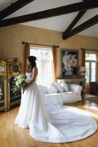 Jessica prepared in the estate’s bridal suite, a room filled with antique details, folding gilded screens, porcelain accents, and a chaise lounge that felt made for portraiture. Her gown carried a dramatic train, more than a meter long, moving through the room like it belonged there.