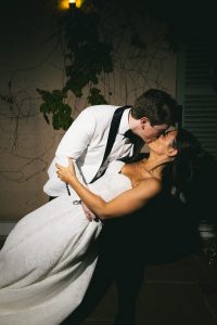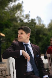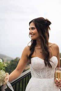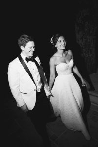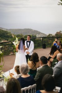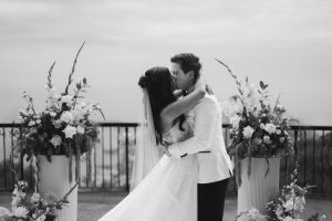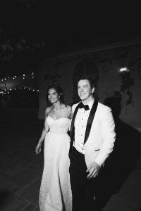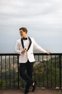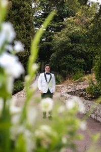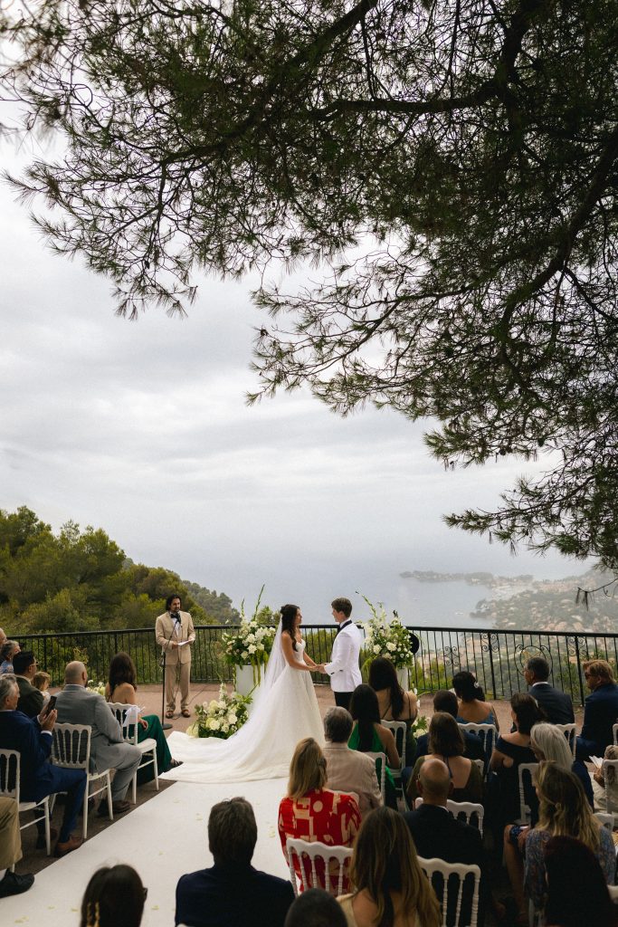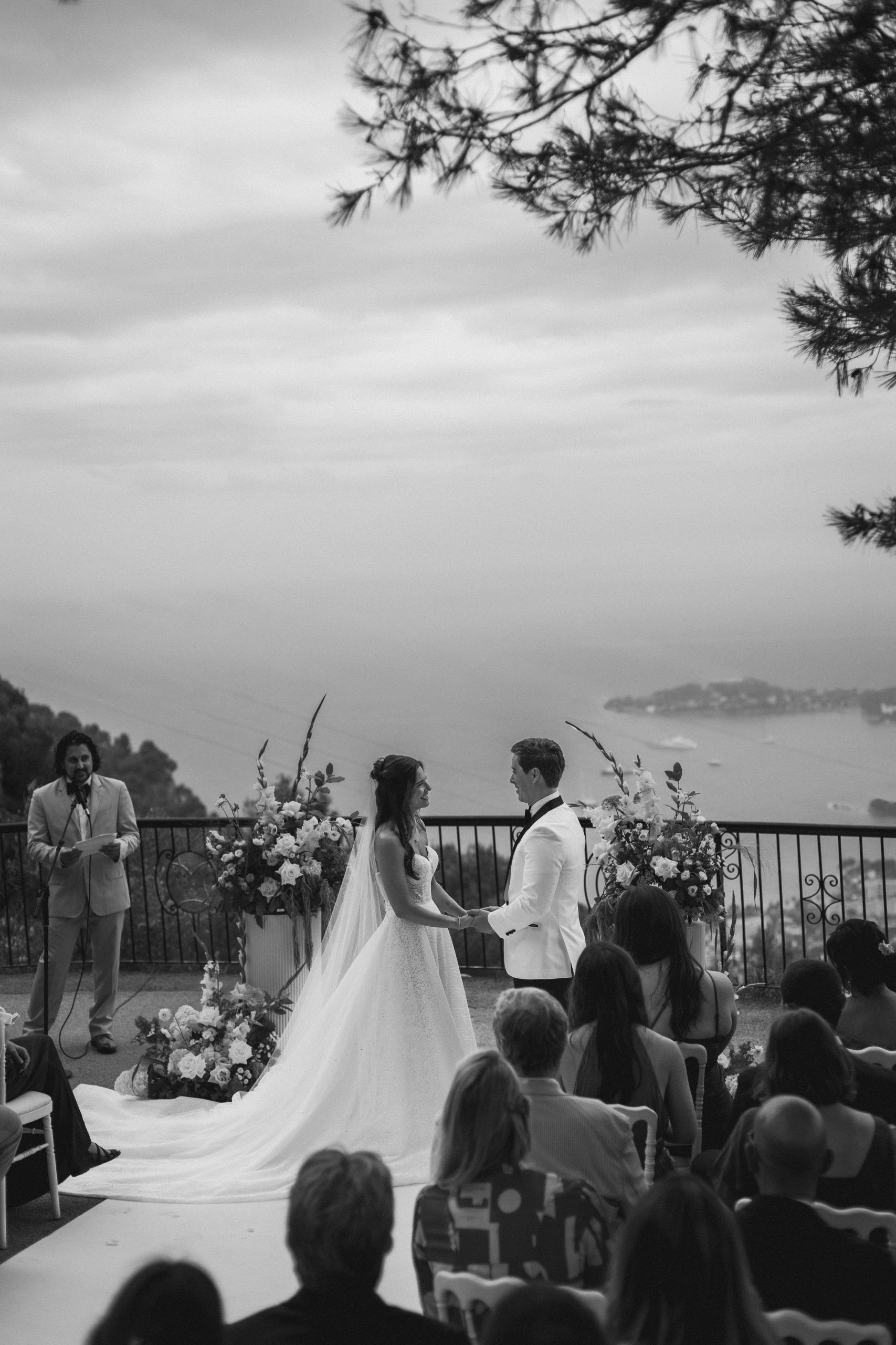 He had been slightly nervous during the morning preparations, focused on details and logistics. But the moment he saw Jessica in her gown, everything shifted. He was visibly moved, almost stunned, as if trying to take in the scale of the moment and the elegance of it all. The contrast between his Coppley tuxedo with its black shawl lapels and her long, sculptural train worked perfectly against the Riviera backdrop.