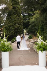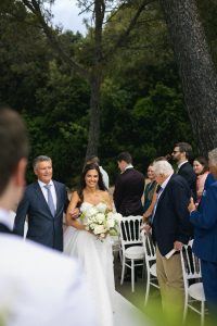 Slide Garden pathway at Mont Leuze wedding venue Outdoor wedding ceremony in Provence at Mont Leuze Wedding guest detail with green dress and Jacquemus handbag Ornamental iron gate detail at Mont Leuze Groomsmen walking during the wedding at Mont Leuze View over Nice from Mont Leuze wedding venue Floral design detail at Mont Leuze wedding ceremony