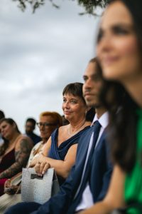 At the same time, the ceremony space was coming together on the balcony of Mont Leuze. The floral design framed the aisle in soft greens and whites, echoing the tones chosen for the bridal party. The dress code was cohesive without being rigid. Deep greens, tailored silhouettes, fluid fabrics. Effortless, elegant, intentional.